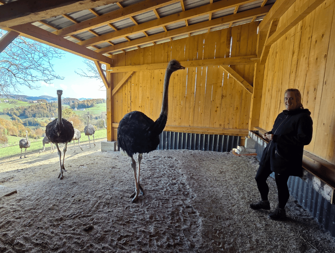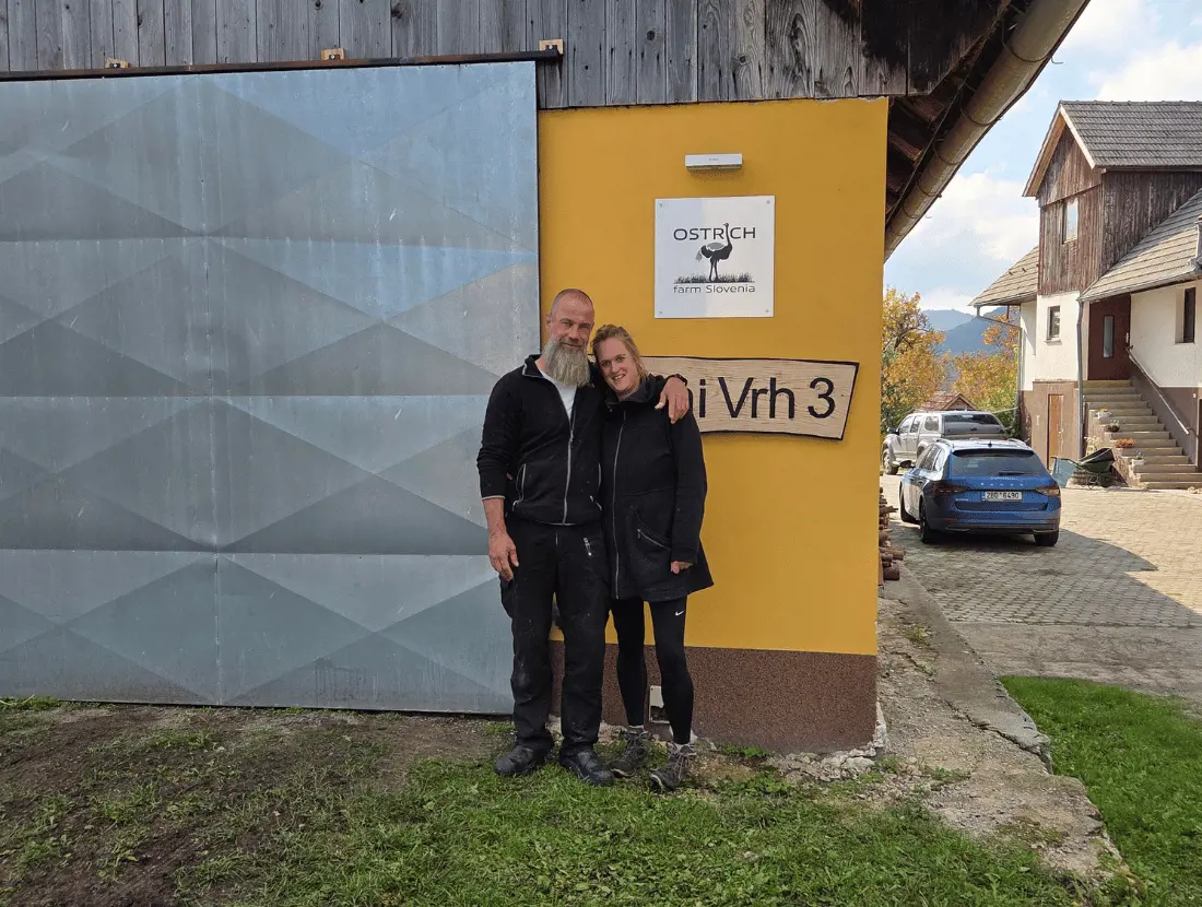 For Niels van Gerven and Kirsten Claessens, life used to look very different. Born in the Netherlands, Niels worked as an optometrist while Kirsten built her career as a process manager in international companies. In 2016 they met, discovered they shared the same dreams, and soon imagined a new life — one closer to nature and far away from the daily rush. During a holiday in Slovenia in 2018, they fell in love with the landscape and the peacefulness of the Savinja region. In 2024, they took the leap. They sold their home in the Netherlands, moved to a secluded farmstead in the village of Blatni Vrh, and started building something completely new: their own ostrich farm.
